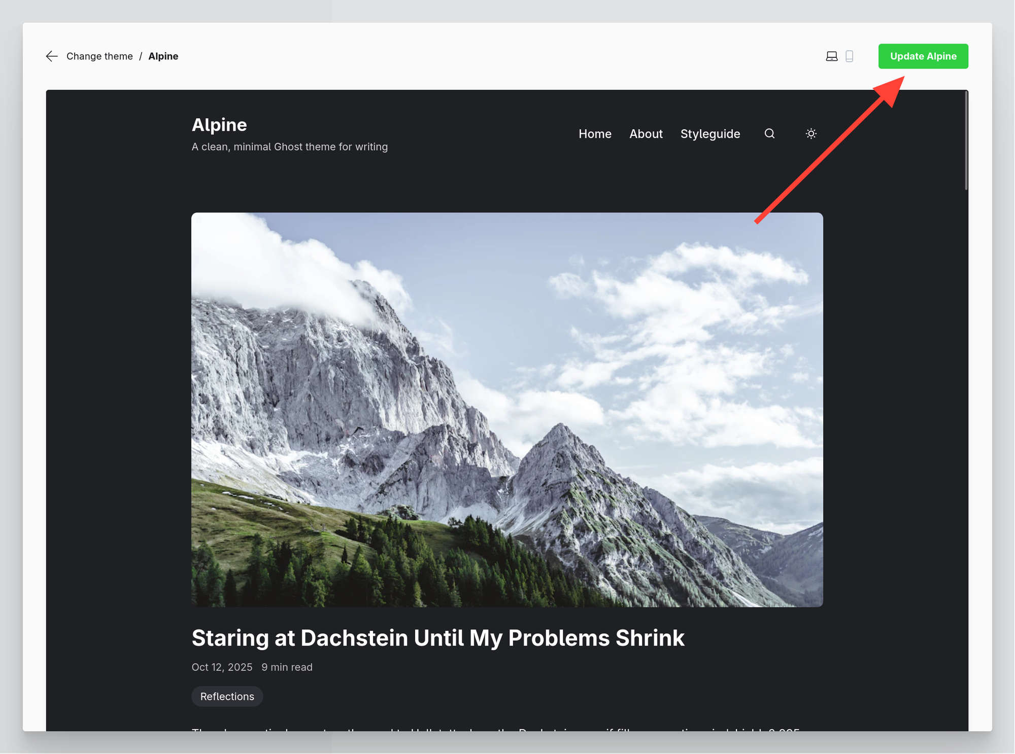 To get access to this feature, all you need to do is update the theme. You can do so by navigating to Settings > Themes. There, you select your theme, and then click the green Update [Theme name] button.