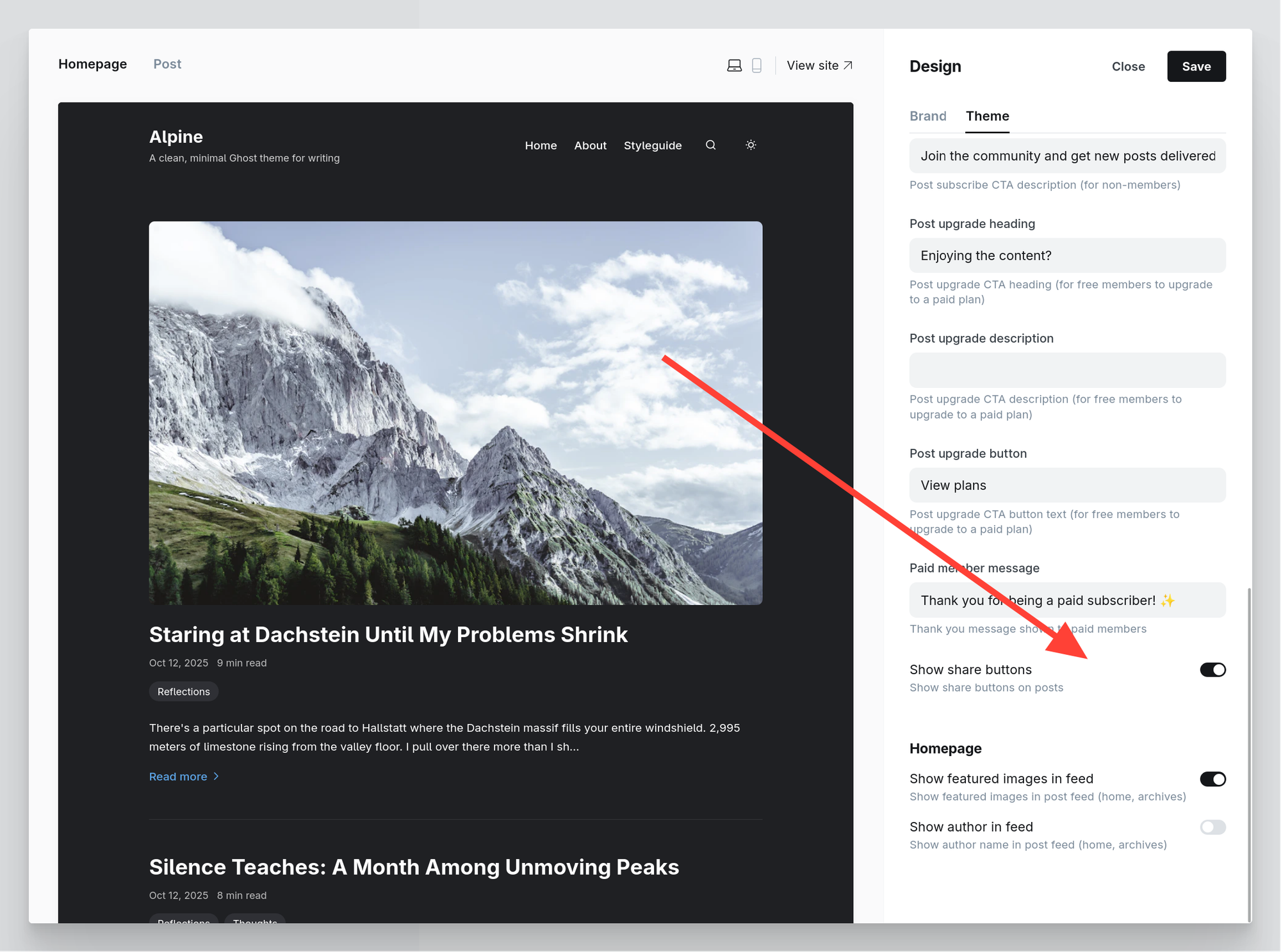 All Magic Pages exclusive themes (Vienna, Berlin, Kyiv, Alpine) have just been updated to support Ghost's new native share buttons: