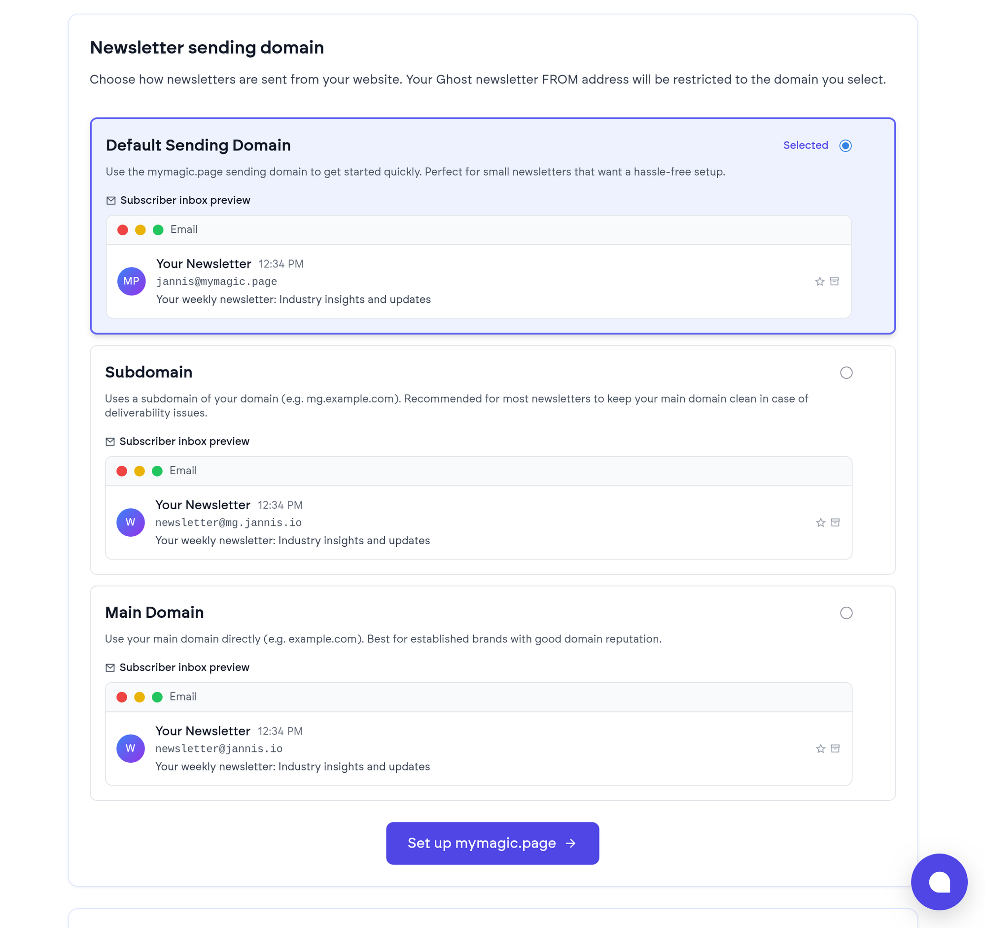 sending domain: Your from address for all outgoing emails will be [subdomain]@mymagic.page. E.g. "jannis@mymagic.page" for my own blog.- Subdomain: If you choose to send through a subdomain, you can choose any sender on that particular subdomain, e.g. "jannis@mg.jannis.io", "newsletter@mg.jannis.io", etc.