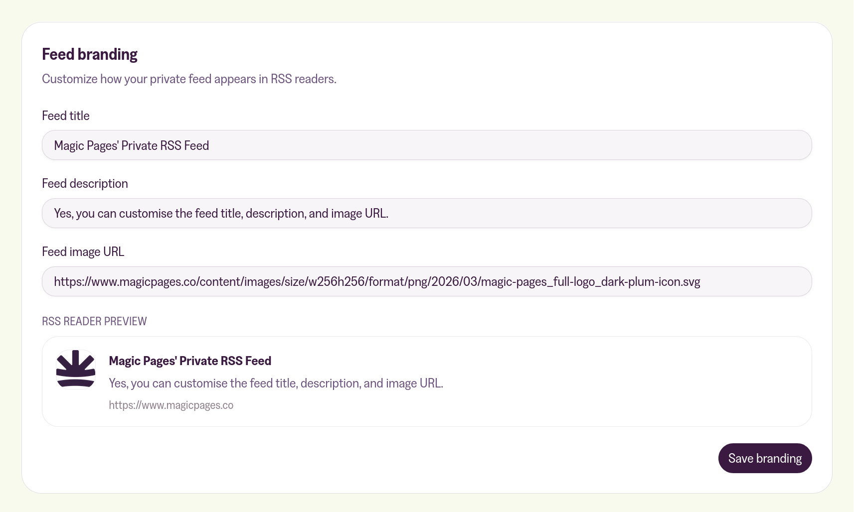 The entire feature is managed from your Magic Pages Customer Portal. You flip one setting, optionally customize the feed title and the welcome email your members receive, and you're done. No Ghost configuration, no theme changes, no webhooks to set up.