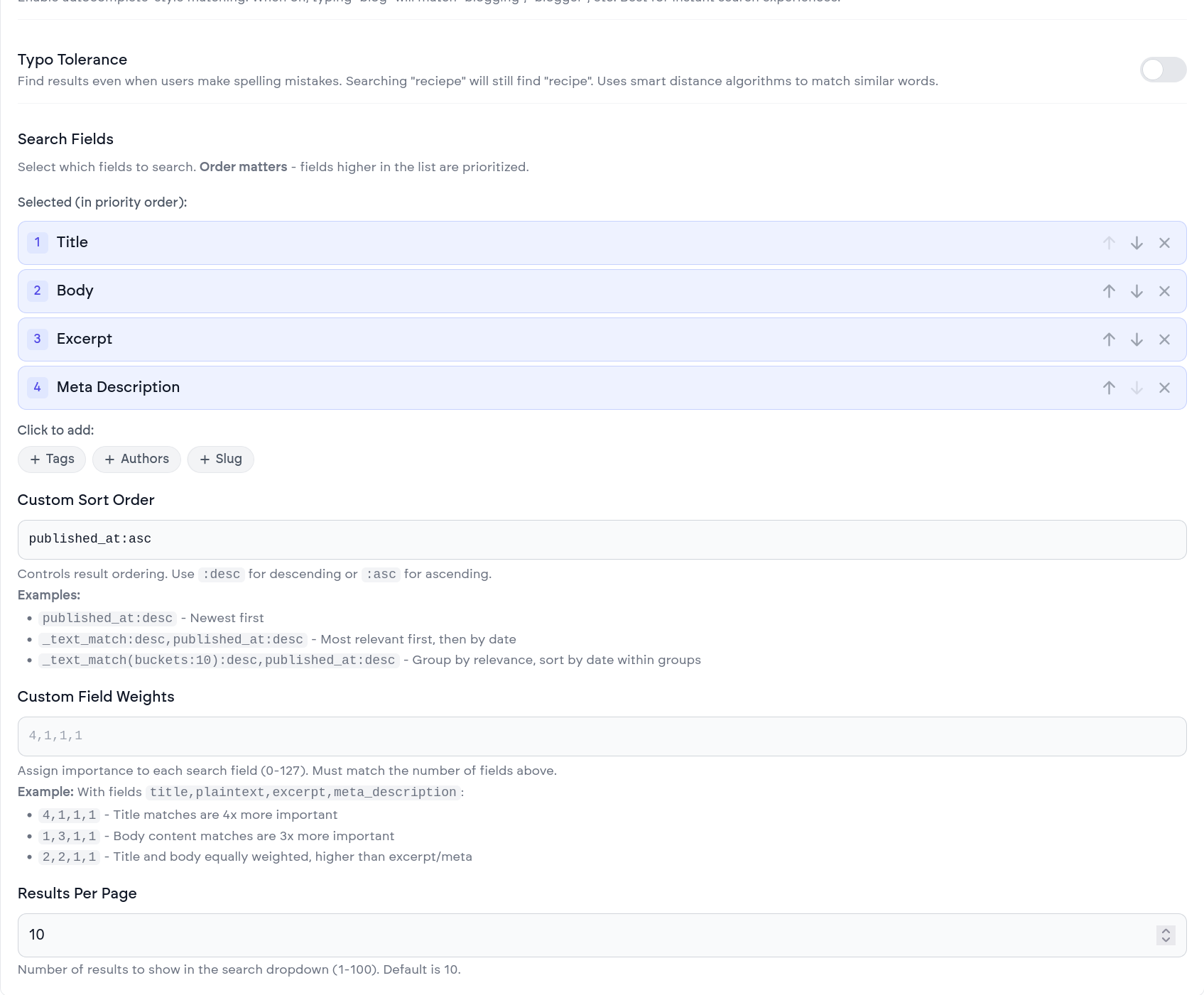 With this update, Magic Pages customers on the Pro plan can now fine-tune exactly how the Typesense-based Advanced Search ranks results. I've added a new Search Ranking section to the Search Configuration panel inside the customer portal with three powerful options: